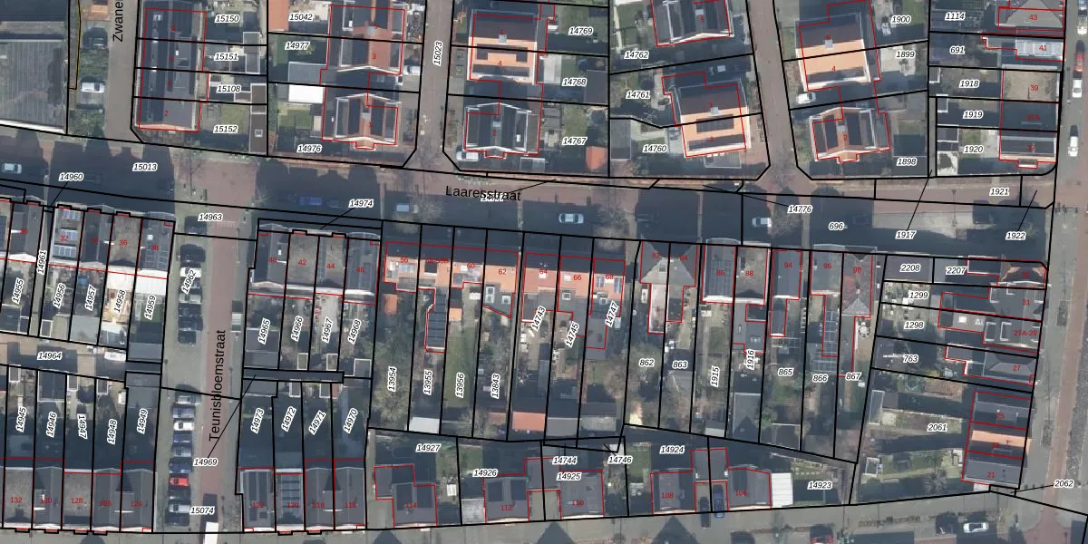 Het perceel waarop Laaresstraat 64 staat heeft een oppervlakte van 262 m². Dit is een middelgroot perceel. De perceeloppervlakte wordt geregistreerd door het Kadaster. Gedetailleerde informatie over de maten van dit perceel kunt u vinden in het rapport Kadastrale kaart met maatvoering van Laaresstraat 64.