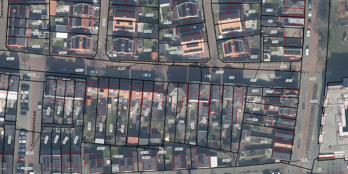 Het perceel waarop Laaresstraat 82 staat heeft een oppervlakte van 225 m². Dit is een middelgroot perceel. De perceeloppervlakte wordt geregistreerd door het Kadaster. Gedetailleerde informatie over de maten van dit perceel kunt u vinden in het rapport Kadastrale kaart met maatvoering van Laaresstraat 82.