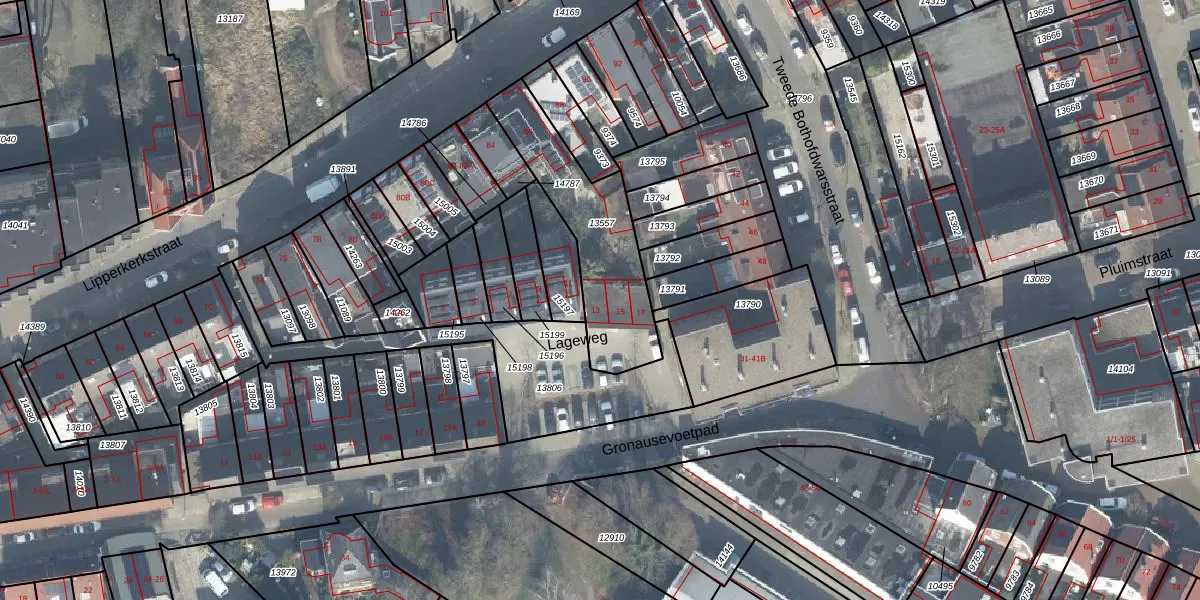 Lageweg 13 is gelegen op kadastraal perceel ESD00D13557. Deze kadastrale aanduiding is uniek en wordt gebruikt door het Kadaster om eigendomsrechten en andere zakelijke rechten vast te leggen. Het perceel maakt onderdeel uit van de kadastrale gemeente Enschede.