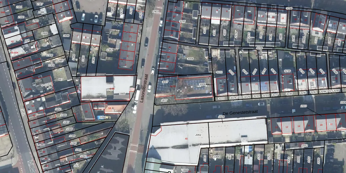 Het perceel waarop Lasonderstraat 56 staat heeft een oppervlakte van 553 m². Dit is een groot perceel. De perceeloppervlakte wordt geregistreerd door het Kadaster. Gedetailleerde informatie over de maten van dit perceel kunt u vinden in het rapport Kadastrale kaart met maatvoering van Lasonderstraat 56.