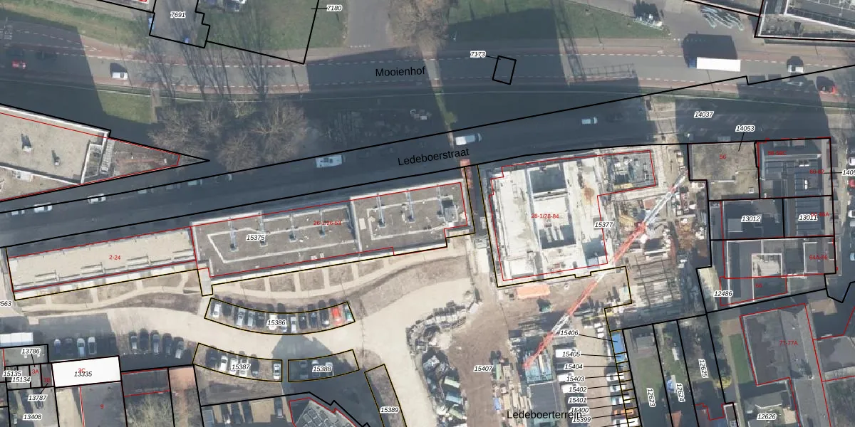 Het perceel waarop Ledeboerstraat 26-28 staat heeft een oppervlakte van 1706 m². Dit is een zeer groot perceel. De perceeloppervlakte wordt geregistreerd door het Kadaster. Gedetailleerde informatie over de maten van dit perceel kunt u vinden in het rapport Kadastrale kaart met maatvoering van Ledeboerstraat 26-28.