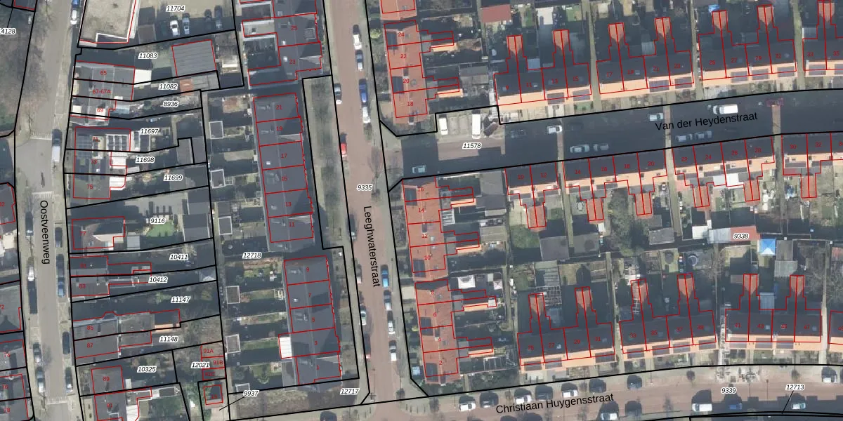 Het perceel waarop Leeghwaterstraat 14 staat heeft een oppervlakte van 9019 m². Dit is een zeer groot perceel. De perceeloppervlakte wordt geregistreerd door het Kadaster. Gedetailleerde informatie over de maten van dit perceel kunt u vinden in het rapport Kadastrale kaart met maatvoering van Leeghwaterstraat 14.