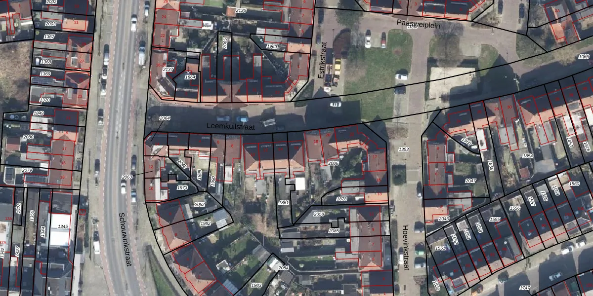 Het perceel waarop Leemkuilstraat 16 staat heeft een oppervlakte van 743 m². Dit is een groot perceel. De perceeloppervlakte wordt geregistreerd door het Kadaster. Gedetailleerde informatie over de maten van dit perceel kunt u vinden in het rapport Kadastrale kaart met maatvoering van Leemkuilstraat 16.