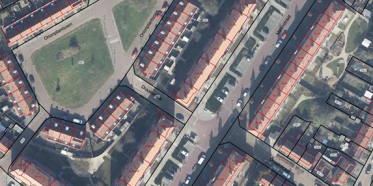 Het perceel waarop Maanstraat 72 staat heeft een oppervlakte van 4410 m². Dit is een zeer groot perceel. De perceeloppervlakte wordt geregistreerd door het Kadaster. Gedetailleerde informatie over de maten van dit perceel kunt u vinden in het rapport Kadastrale kaart met maatvoering van Maanstraat 72.