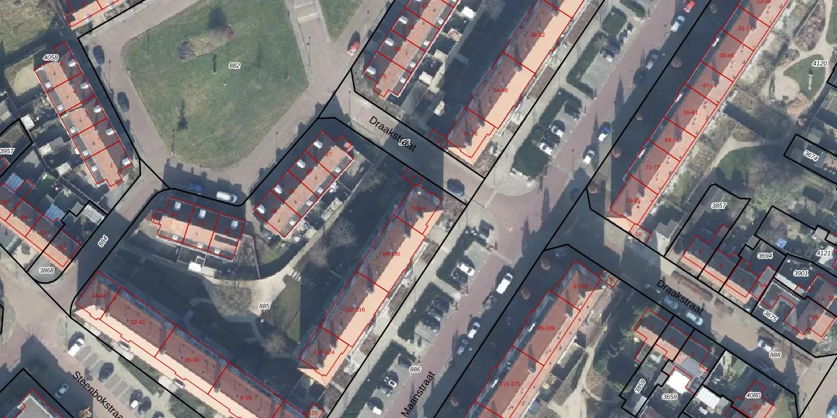 Het perceel waarop Maanstraat 82 staat heeft een oppervlakte van 4230 m². Dit is een zeer groot perceel. De perceeloppervlakte wordt geregistreerd door het Kadaster. Gedetailleerde informatie over de maten van dit perceel kunt u vinden in het rapport Kadastrale kaart met maatvoering van Maanstraat 82.