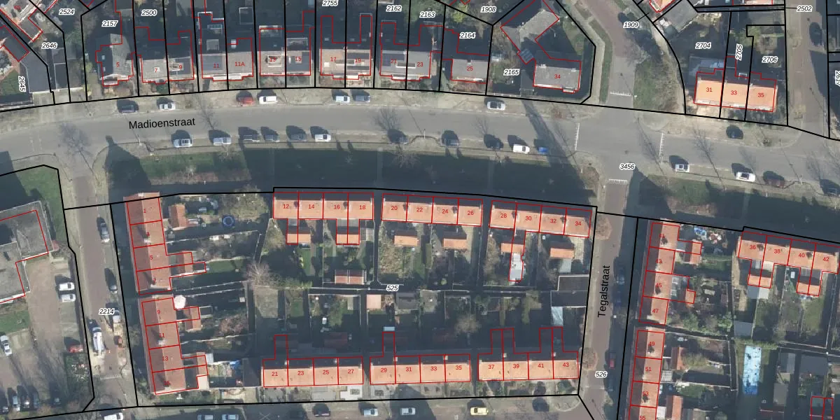 Het perceel waarop Madioenstraat 22 staat heeft een oppervlakte van 5420 m². Dit is een zeer groot perceel. De perceeloppervlakte wordt geregistreerd door het Kadaster. Gedetailleerde informatie over de maten van dit perceel kunt u vinden in het rapport Kadastrale kaart met maatvoering van Madioenstraat 22.