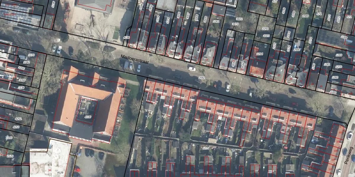 Het perceel waarop Madoerastraat 12 staat heeft een oppervlakte van 6480 m². Dit is een zeer groot perceel. De perceeloppervlakte wordt geregistreerd door het Kadaster. Gedetailleerde informatie over de maten van dit perceel kunt u vinden in het rapport Kadastrale kaart met maatvoering van Madoerastraat 12.