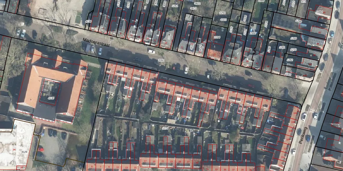 Het perceel waarop Madoerastraat 20 staat heeft een oppervlakte van 6480 m². Dit is een zeer groot perceel. De perceeloppervlakte wordt geregistreerd door het Kadaster. Gedetailleerde informatie over de maten van dit perceel kunt u vinden in het rapport Kadastrale kaart met maatvoering van Madoerastraat 20.