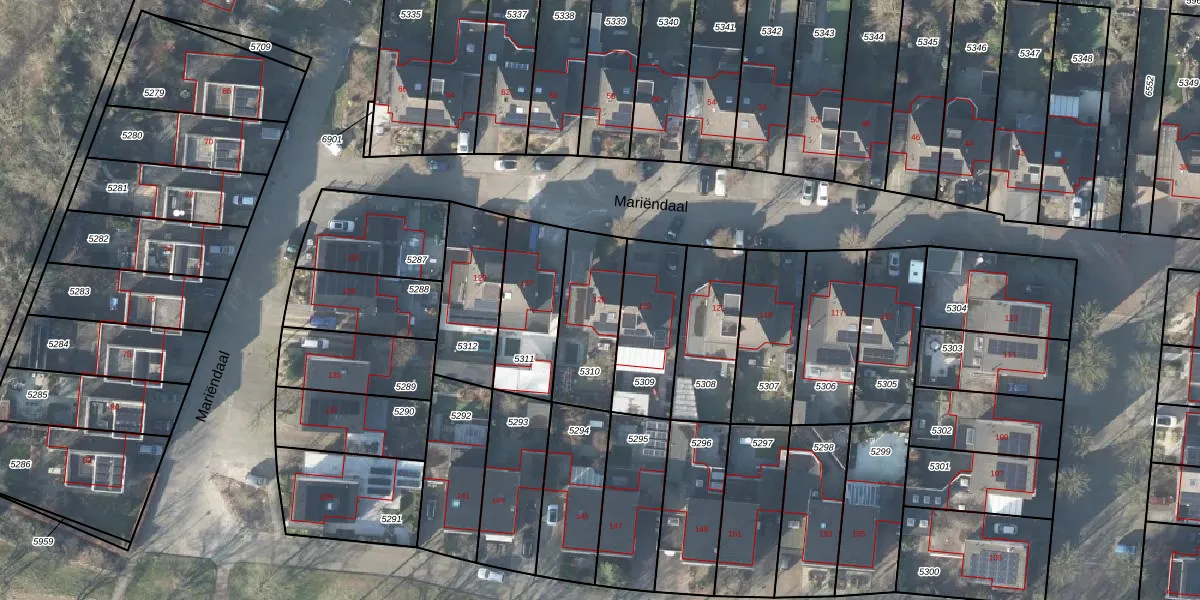 Het perceel waarop Mariëndaal 125 staat heeft een oppervlakte van 290 m². Dit is een middelgroot perceel. De perceeloppervlakte wordt geregistreerd door het Kadaster. Gedetailleerde informatie over de maten van dit perceel kunt u vinden in het rapport Kadastrale kaart met maatvoering van Mariëndaal 125.