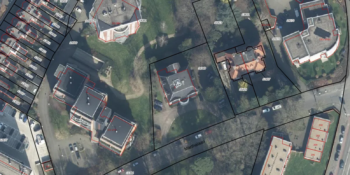 Het perceel waarop Marthalaan 5 staat heeft een oppervlakte van 1945 m². Dit is een zeer groot perceel. De perceeloppervlakte wordt geregistreerd door het Kadaster. Gedetailleerde informatie over de maten van dit perceel kunt u vinden in het rapport Kadastrale kaart met maatvoering van Marthalaan 5.