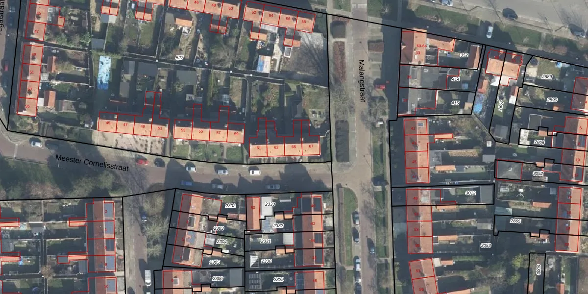 Het perceel waarop Meester Cornelisstraat 65 staat heeft een oppervlakte van 6035 m². Dit is een zeer groot perceel. De perceeloppervlakte wordt geregistreerd door het Kadaster. Gedetailleerde informatie over de maten van dit perceel kunt u vinden in het rapport Kadastrale kaart met maatvoering van Meester Cornelisstraat 65.