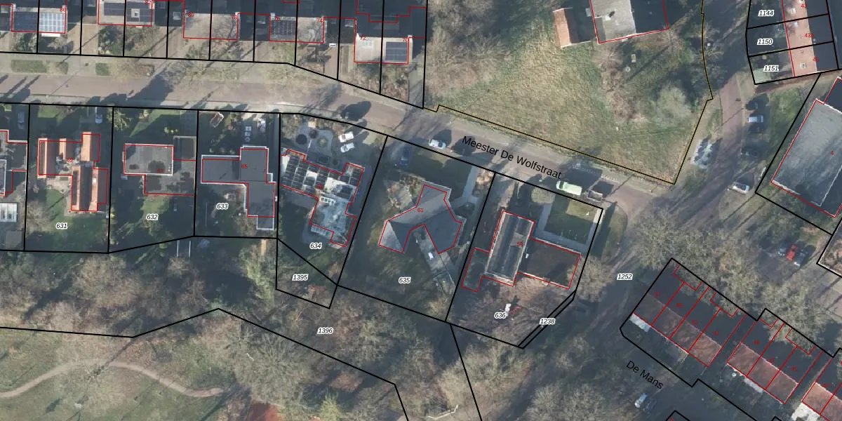 Het perceel waarop Meester De Wolfstraat 61 staat heeft een oppervlakte van 1007 m². Dit is een zeer groot perceel. De perceeloppervlakte wordt geregistreerd door het Kadaster. Gedetailleerde informatie over de maten van dit perceel kunt u vinden in het rapport Kadastrale kaart met maatvoering van Meester De Wolfstraat 61.