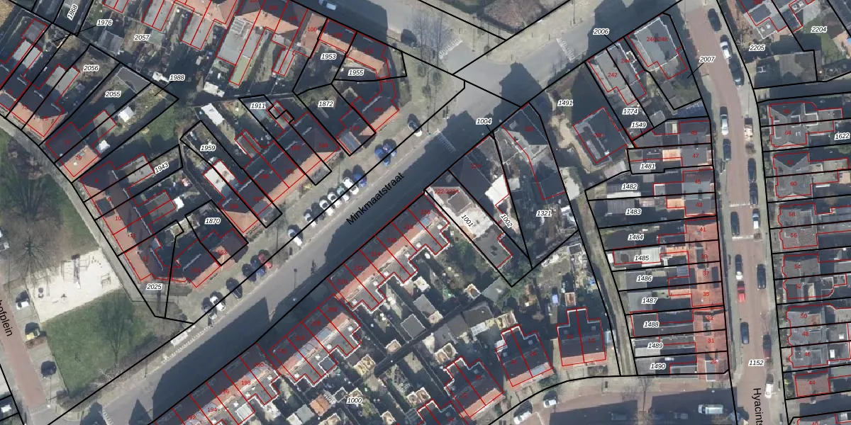 Het perceel waarop Minkmaatstraat 220 staat heeft een oppervlakte van 6433 m². Dit is een zeer groot perceel. De perceeloppervlakte wordt geregistreerd door het Kadaster. Gedetailleerde informatie over de maten van dit perceel kunt u vinden in het rapport Kadastrale kaart met maatvoering van Minkmaatstraat 220.