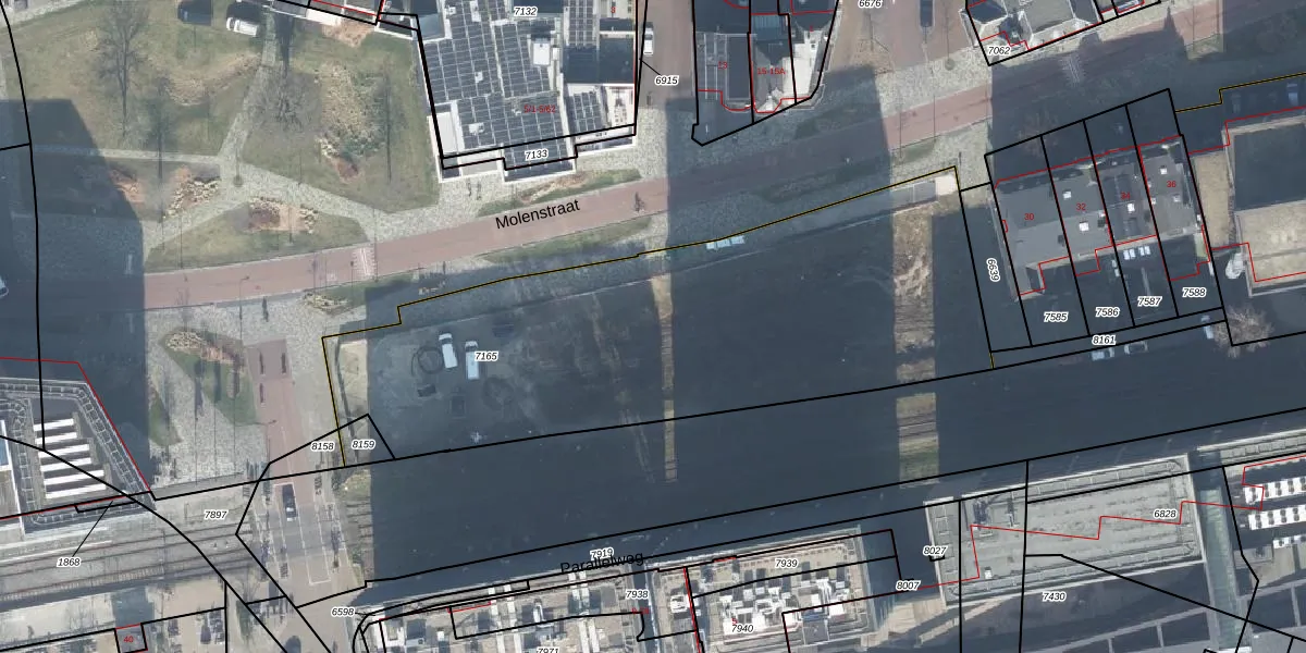 Het perceel waarop Molenstraat 12-102 staat heeft een oppervlakte van 2535 m². Dit is een zeer groot perceel. De perceeloppervlakte wordt geregistreerd door het Kadaster. Gedetailleerde informatie over de maten van dit perceel kunt u vinden in het rapport Kadastrale kaart met maatvoering van Molenstraat 12-102.