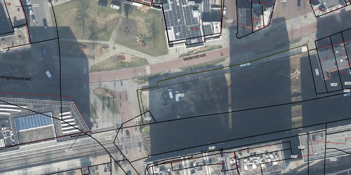 Het perceel waarop Molenstraat 4-33 staat heeft een oppervlakte van 2535 m². Dit is een zeer groot perceel. De perceeloppervlakte wordt geregistreerd door het Kadaster. Gedetailleerde informatie over de maten van dit perceel kunt u vinden in het rapport Kadastrale kaart met maatvoering van Molenstraat 4-33.