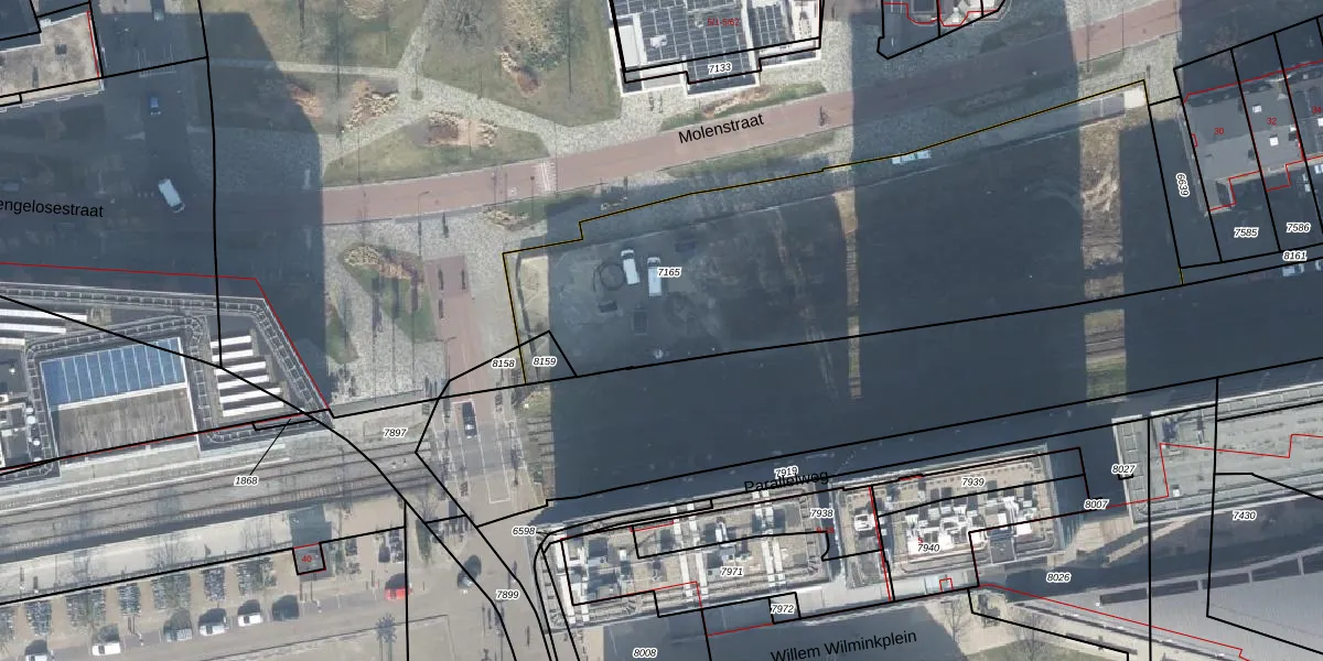 Het perceel waarop Molenstraat 4-54 staat heeft een oppervlakte van 2535 m². Dit is een zeer groot perceel. De perceeloppervlakte wordt geregistreerd door het Kadaster. Gedetailleerde informatie over de maten van dit perceel kunt u vinden in het rapport Kadastrale kaart met maatvoering van Molenstraat 4-54.