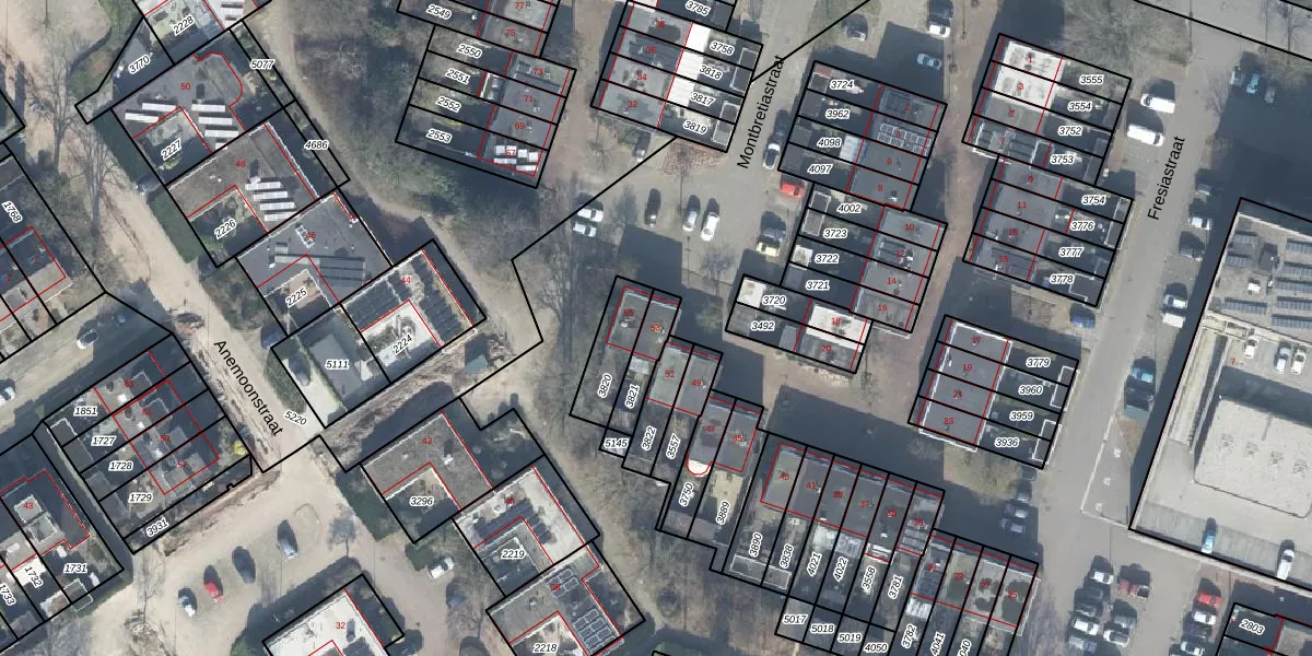 Het perceel waarop Montbretiastraat 53 staat heeft een oppervlakte van 91 m². Dit is een klein perceel. De perceeloppervlakte wordt geregistreerd door het Kadaster. Gedetailleerde informatie over de maten van dit perceel kunt u vinden in het rapport Kadastrale kaart met maatvoering van Montbretiastraat 53.