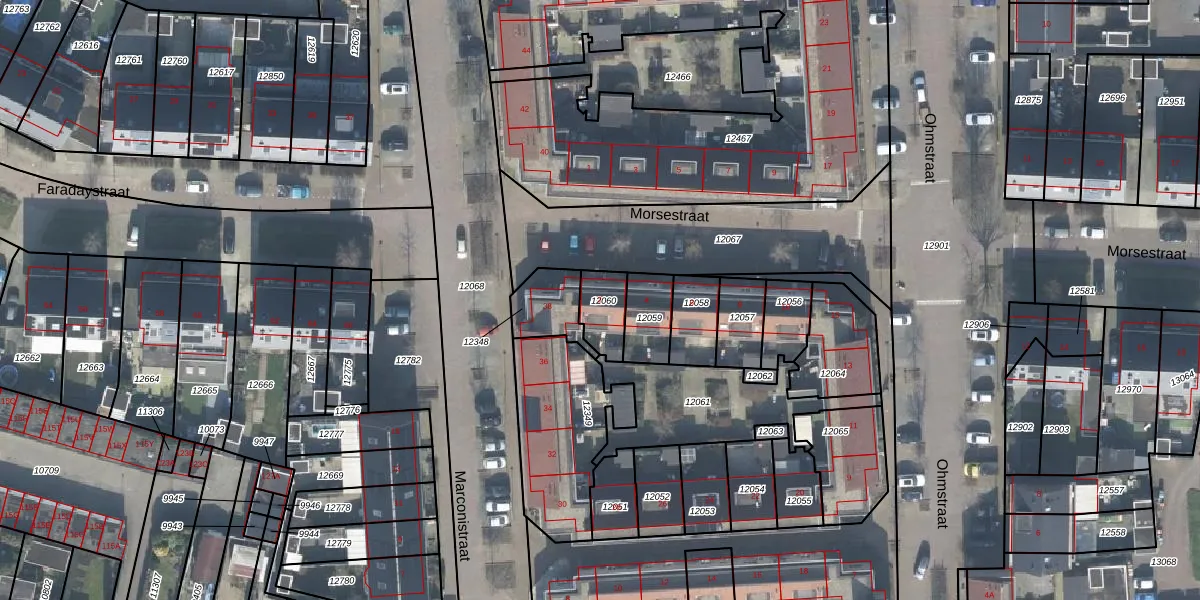 Gebruik de zoekbalk of klik op een perceel voor informatie over de adressen binnen dit perceel.