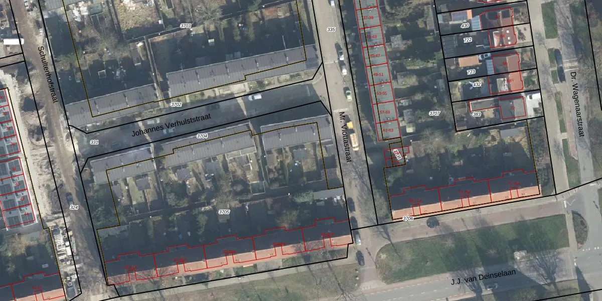 Het perceel waarop Mr. Viottastraat 42 staat heeft een oppervlakte van 3443 m². Dit is een zeer groot perceel. De perceeloppervlakte wordt geregistreerd door het Kadaster. Gedetailleerde informatie over de maten van dit perceel kunt u vinden in het rapport Kadastrale kaart met maatvoering van Mr. Viottastraat 42.