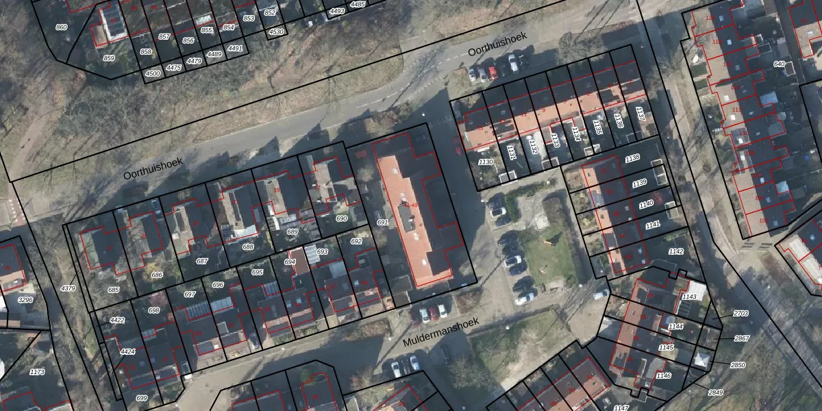 Het perceel waarop Muldermanshoek 45 staat heeft een oppervlakte van 846 m². Dit is een groot perceel. De perceeloppervlakte wordt geregistreerd door het Kadaster. Gedetailleerde informatie over de maten van dit perceel kunt u vinden in het rapport Kadastrale kaart met maatvoering van Muldermanshoek 45.