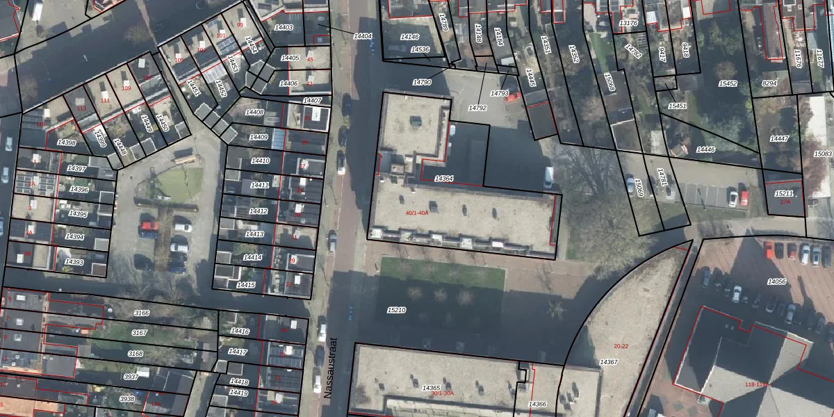 Het perceel waarop Nassaustraat 40-9 staat heeft een oppervlakte van 1184 m². Dit is een zeer groot perceel. De perceeloppervlakte wordt geregistreerd door het Kadaster. Gedetailleerde informatie over de maten van dit perceel kunt u vinden in het rapport Kadastrale kaart met maatvoering van Nassaustraat 40-9.