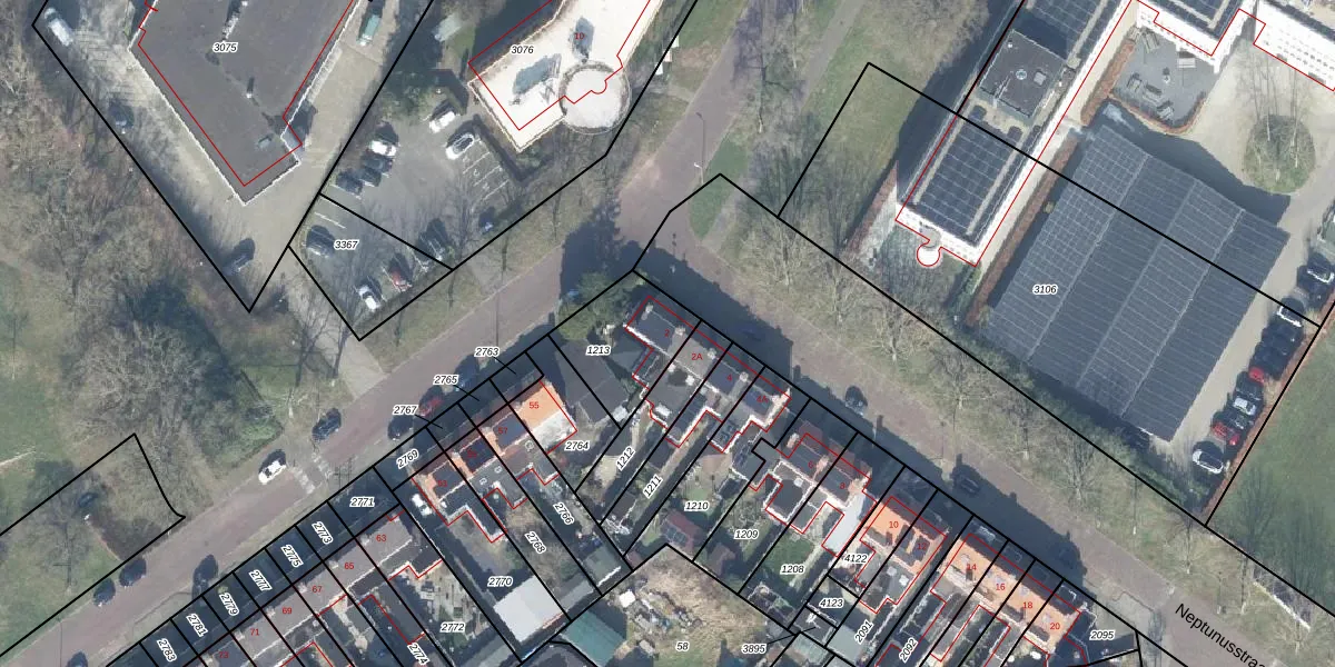 Het perceel waarop Neptunusstraat 2 staat heeft een oppervlakte van 277 m². Dit is een middelgroot perceel. De perceeloppervlakte wordt geregistreerd door het Kadaster. Gedetailleerde informatie over de maten van dit perceel kunt u vinden in het rapport Kadastrale kaart met maatvoering van Neptunusstraat 2.