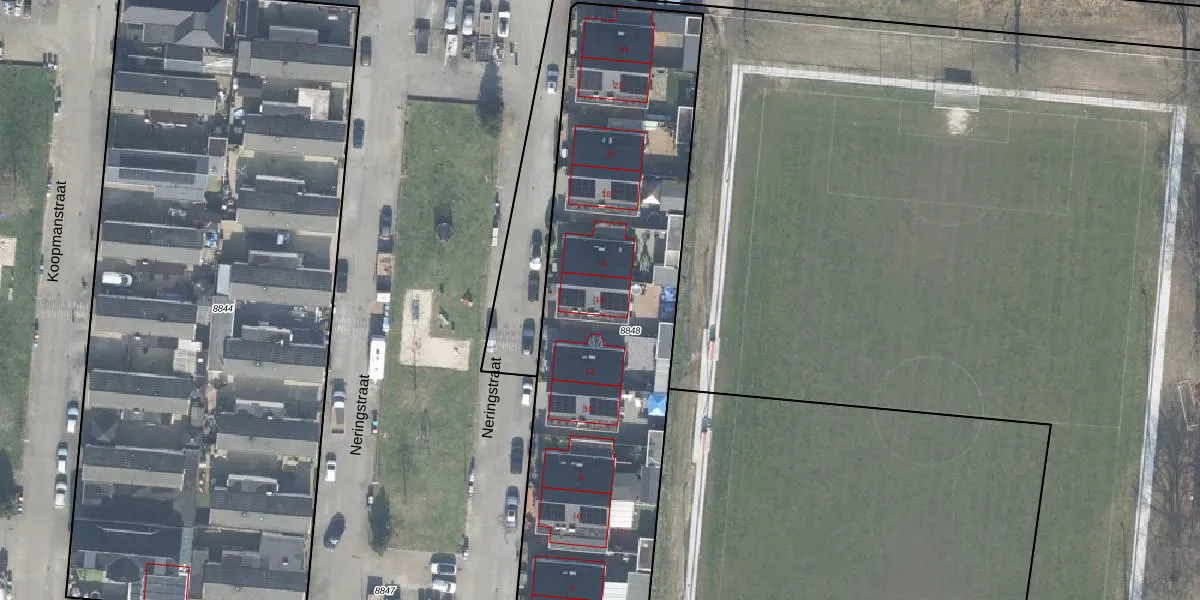 Het perceel waarop Neringstraat 14 staat heeft een oppervlakte van 2379 m². Dit is een zeer groot perceel. De perceeloppervlakte wordt geregistreerd door het Kadaster. Gedetailleerde informatie over de maten van dit perceel kunt u vinden in het rapport Kadastrale kaart met maatvoering van Neringstraat 14.