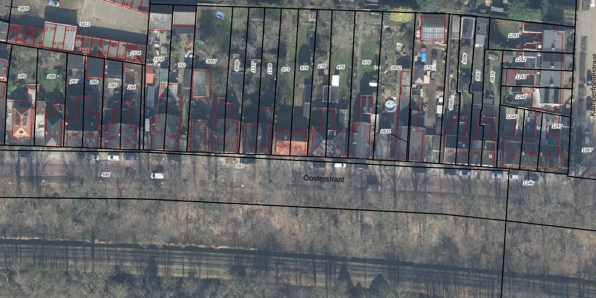 Het perceel waarop Oosterstraat 176 staat heeft een oppervlakte van 303 m². Dit is een groot perceel. De perceeloppervlakte wordt geregistreerd door het Kadaster. Gedetailleerde informatie over de maten van dit perceel kunt u vinden in het rapport Kadastrale kaart met maatvoering van Oosterstraat 176.
