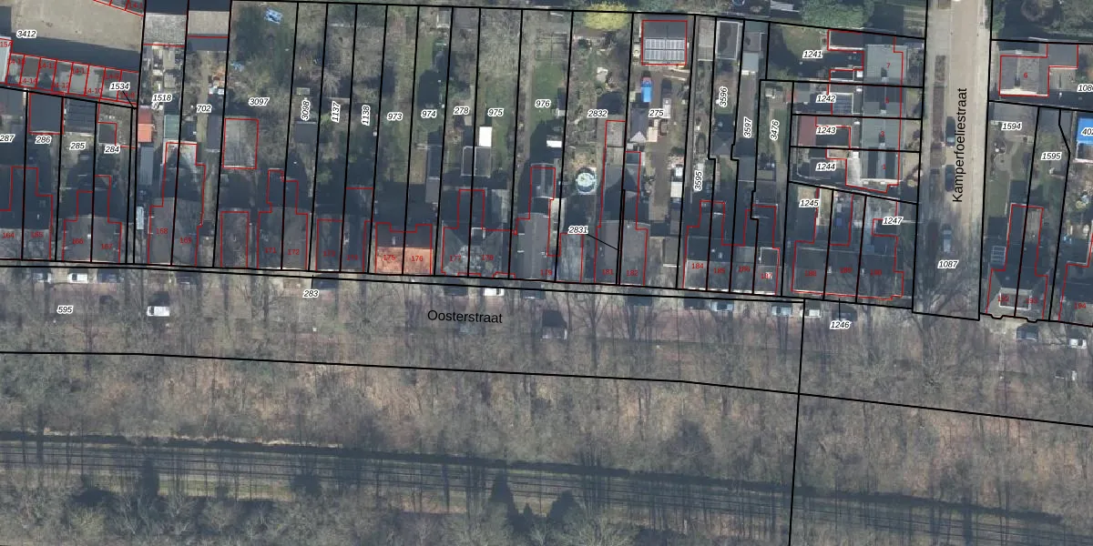 Het perceel waarop Oosterstraat 179 staat heeft een oppervlakte van 443 m². Dit is een groot perceel. De perceeloppervlakte wordt geregistreerd door het Kadaster. Gedetailleerde informatie over de maten van dit perceel kunt u vinden in het rapport Kadastrale kaart met maatvoering van Oosterstraat 179.