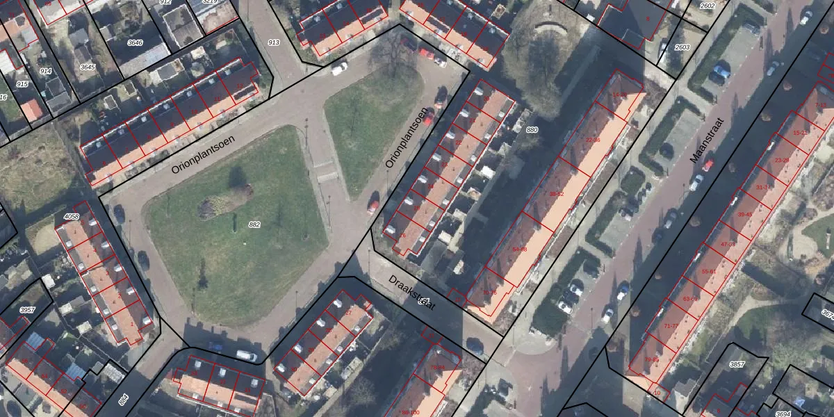Orionplantsoen 25 is gelegen op kadastraal perceel LNK00S880. Deze kadastrale aanduiding is uniek en wordt gebruikt door het Kadaster om eigendomsrechten en andere zakelijke rechten vast te leggen. Het perceel maakt onderdeel uit van de kadastrale gemeente Lonneker.