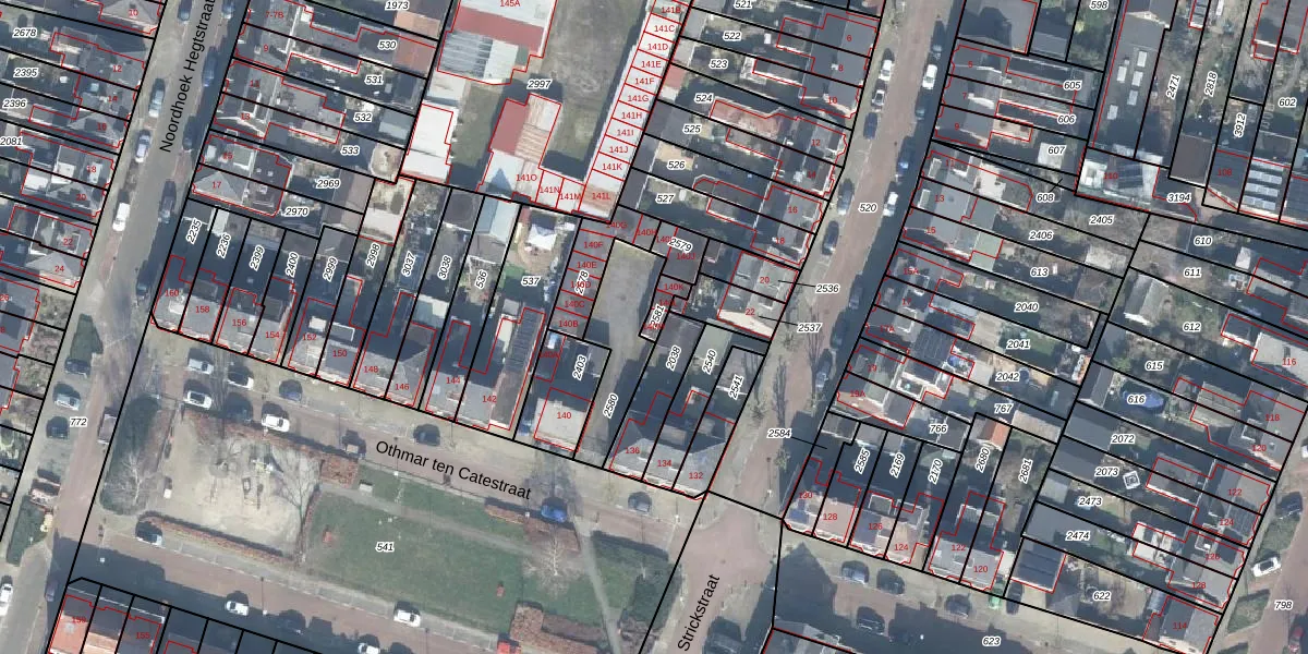 Het perceel waarop Othmar ten Catestraat 140-M staat heeft een oppervlakte van 34 m². Dit is een klein perceel. De perceeloppervlakte wordt geregistreerd door het Kadaster. Gedetailleerde informatie over de maten van dit perceel kunt u vinden in het rapport Kadastrale kaart met maatvoering van Othmar ten Catestraat 140-M.