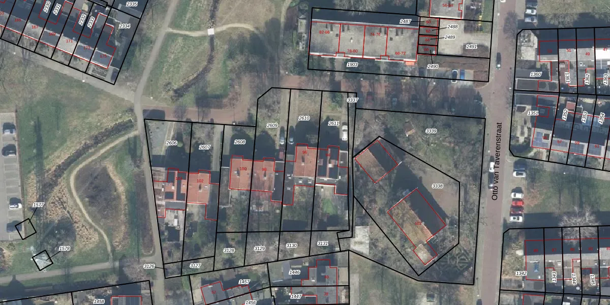 Het perceel waarop Otto van Taverenstraat 96 staat heeft een oppervlakte van 484 m². Dit is een groot perceel. De perceeloppervlakte wordt geregistreerd door het Kadaster. Gedetailleerde informatie over de maten van dit perceel kunt u vinden in het rapport Kadastrale kaart met maatvoering van Otto van Taverenstraat 96.