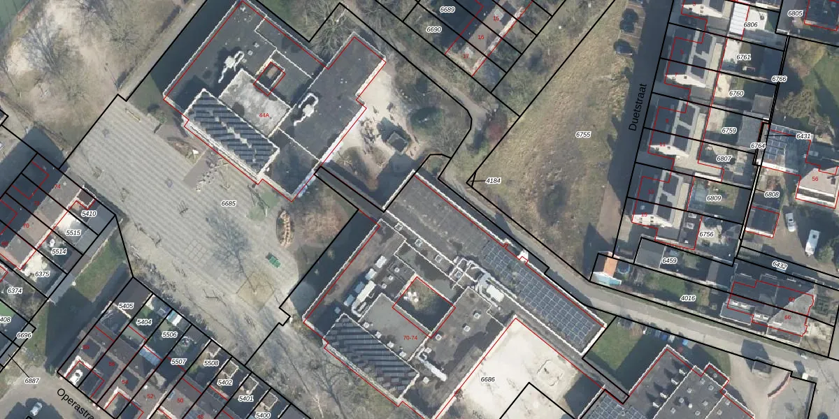 Het perceel waarop Ouverturestraat 74 staat heeft een oppervlakte van 3865 m². Dit is een zeer groot perceel. De perceeloppervlakte wordt geregistreerd door het Kadaster. Gedetailleerde informatie over de maten van dit perceel kunt u vinden in het rapport Kadastrale kaart met maatvoering van Ouverturestraat 74.