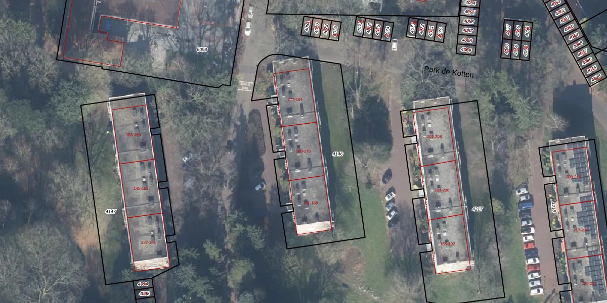 Het perceel waarop Park de Kotten 172 staat heeft een oppervlakte van 1615 m². Dit is een zeer groot perceel. De perceeloppervlakte wordt geregistreerd door het Kadaster. Gedetailleerde informatie over de maten van dit perceel kunt u vinden in het rapport Kadastrale kaart met maatvoering van Park de Kotten 172.