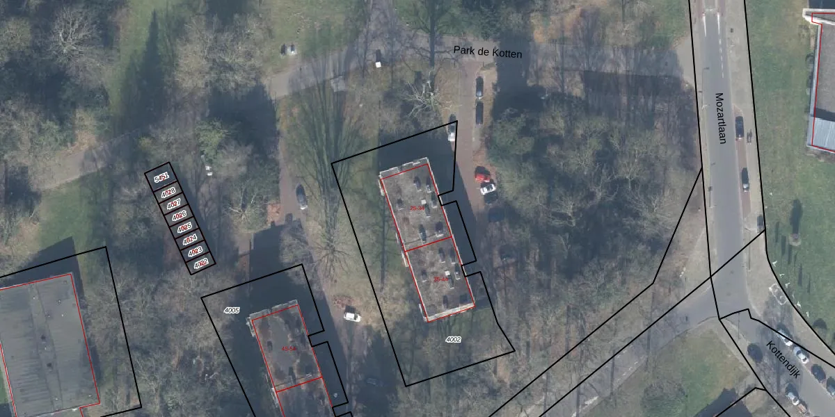 Het perceel waarop Park de Kotten 34 staat heeft een oppervlakte van 1481 m². Dit is een zeer groot perceel. De perceeloppervlakte wordt geregistreerd door het Kadaster. Gedetailleerde informatie over de maten van dit perceel kunt u vinden in het rapport Kadastrale kaart met maatvoering van Park de Kotten 34.