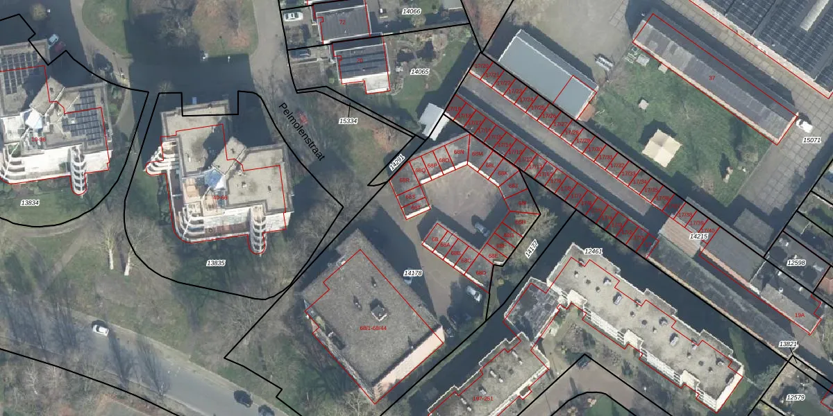 Het perceel waarop Pelmolenstraat 68-T staat heeft een oppervlakte van 2792 m². Dit is een zeer groot perceel. De perceeloppervlakte wordt geregistreerd door het Kadaster. Gedetailleerde informatie over de maten van dit perceel kunt u vinden in het rapport Kadastrale kaart met maatvoering van Pelmolenstraat 68-T.
