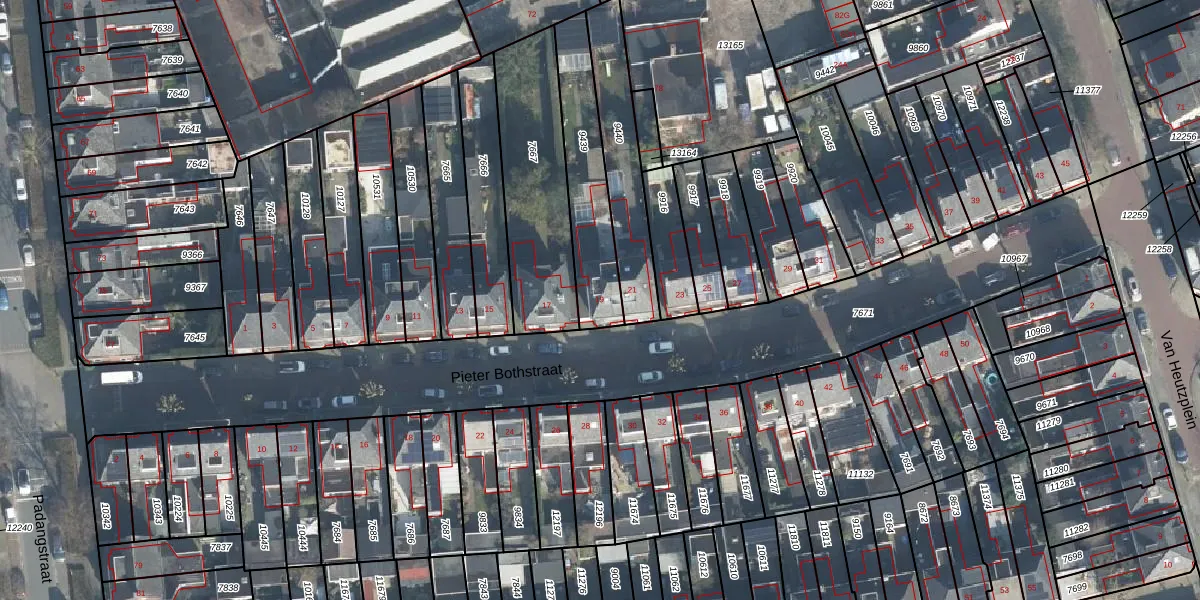 Het perceel waarop Pieter Bothstraat 19 staat heeft een oppervlakte van 335 m². Dit is een groot perceel. De perceeloppervlakte wordt geregistreerd door het Kadaster. Gedetailleerde informatie over de maten van dit perceel kunt u vinden in het rapport Kadastrale kaart met maatvoering van Pieter Bothstraat 19.