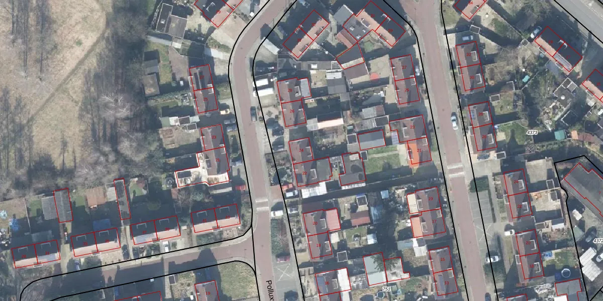 Het perceel waarop Polluxstraat 24 staat heeft een oppervlakte van 1,0 ha. Dit is een zeer groot perceel. De perceeloppervlakte wordt geregistreerd door het Kadaster. Gedetailleerde informatie over de maten van dit perceel kunt u vinden in het rapport Kadastrale kaart met maatvoering van Polluxstraat 24.