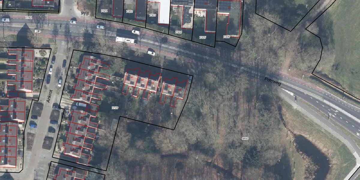 Het perceel waarop Potsweg 98 staat heeft een oppervlakte van 3096 m². Dit is een zeer groot perceel. De perceeloppervlakte wordt geregistreerd door het Kadaster. Gedetailleerde informatie over de maten van dit perceel kunt u vinden in het rapport Kadastrale kaart met maatvoering van Potsweg 98.