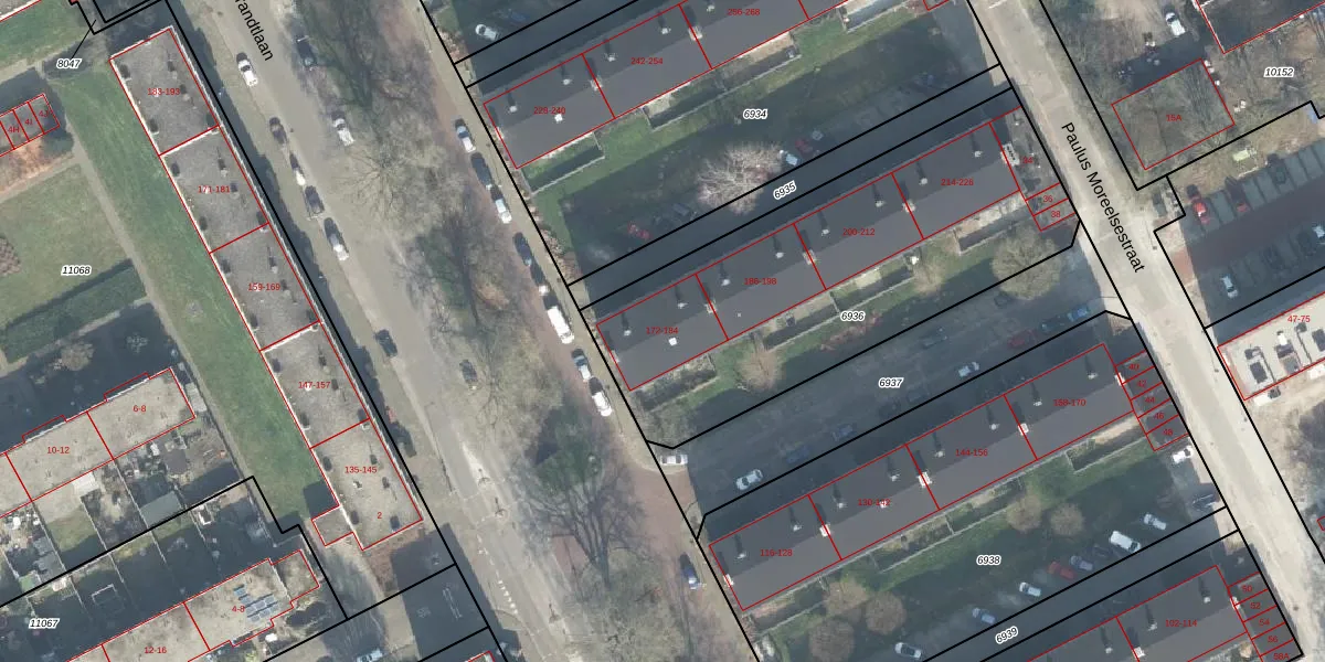 Het perceel waarop Rembrandtlaan 176 staat heeft een oppervlakte van 1865 m². Dit is een zeer groot perceel. De perceeloppervlakte wordt geregistreerd door het Kadaster. Gedetailleerde informatie over de maten van dit perceel kunt u vinden in het rapport Kadastrale kaart met maatvoering van Rembrandtlaan 176.
