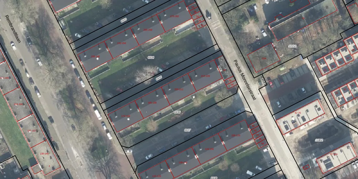 Het perceel waarop Rembrandtlaan 200 staat heeft een oppervlakte van 1865 m². Dit is een zeer groot perceel. De perceeloppervlakte wordt geregistreerd door het Kadaster. Gedetailleerde informatie over de maten van dit perceel kunt u vinden in het rapport Kadastrale kaart met maatvoering van Rembrandtlaan 200.