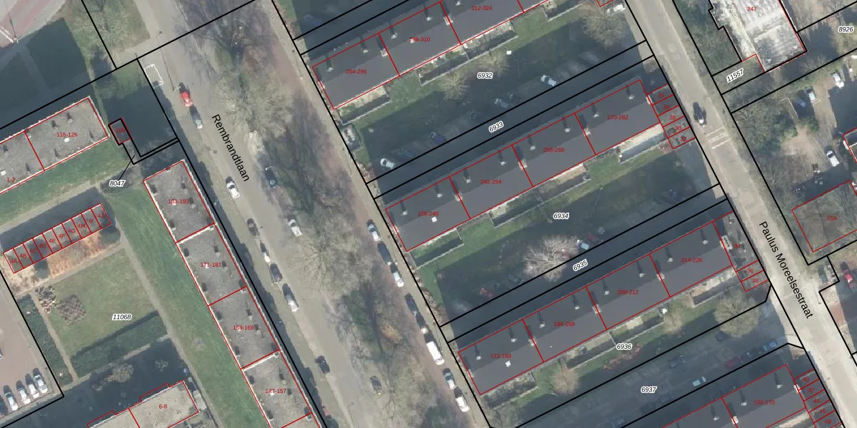 Het perceel waarop Rembrandtlaan 228 staat heeft een oppervlakte van 2465 m². Dit is een zeer groot perceel. De perceeloppervlakte wordt geregistreerd door het Kadaster. Gedetailleerde informatie over de maten van dit perceel kunt u vinden in het rapport Kadastrale kaart met maatvoering van Rembrandtlaan 228.