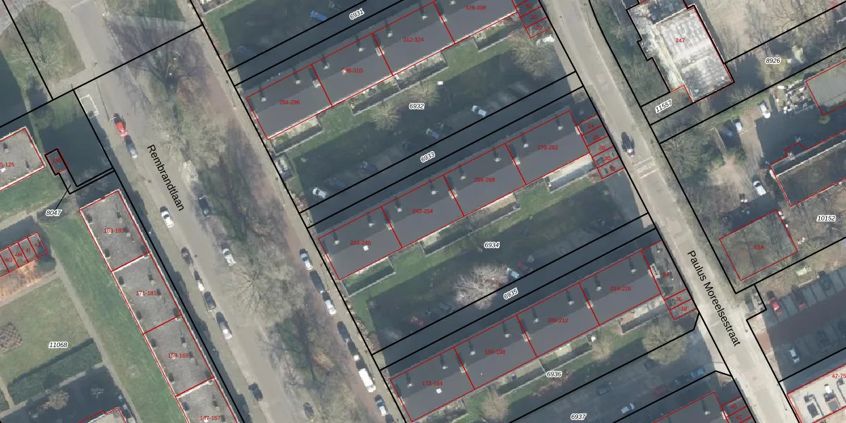 Het perceel waarop Rembrandtlaan 244 staat heeft een oppervlakte van 2465 m². Dit is een zeer groot perceel. De perceeloppervlakte wordt geregistreerd door het Kadaster. Gedetailleerde informatie over de maten van dit perceel kunt u vinden in het rapport Kadastrale kaart met maatvoering van Rembrandtlaan 244.