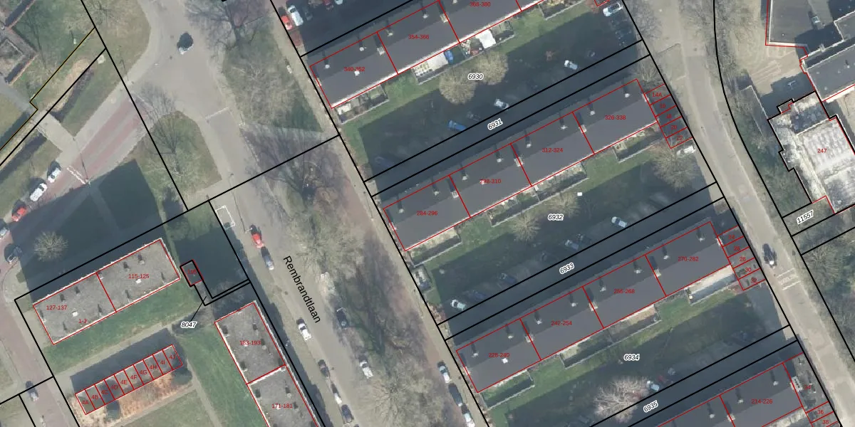 Het perceel waarop Rembrandtlaan 284 staat heeft een oppervlakte van 2465 m². Dit is een zeer groot perceel. De perceeloppervlakte wordt geregistreerd door het Kadaster. Gedetailleerde informatie over de maten van dit perceel kunt u vinden in het rapport Kadastrale kaart met maatvoering van Rembrandtlaan 284.