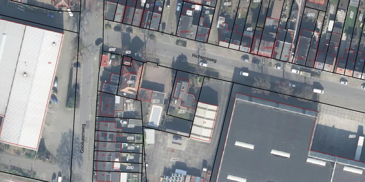 Richtersweg 53 is gelegen op kadastraal perceel ESD00I1643. Deze kadastrale aanduiding is uniek en wordt gebruikt door het Kadaster om eigendomsrechten en andere zakelijke rechten vast te leggen. Het perceel maakt onderdeel uit van de kadastrale gemeente Enschede.