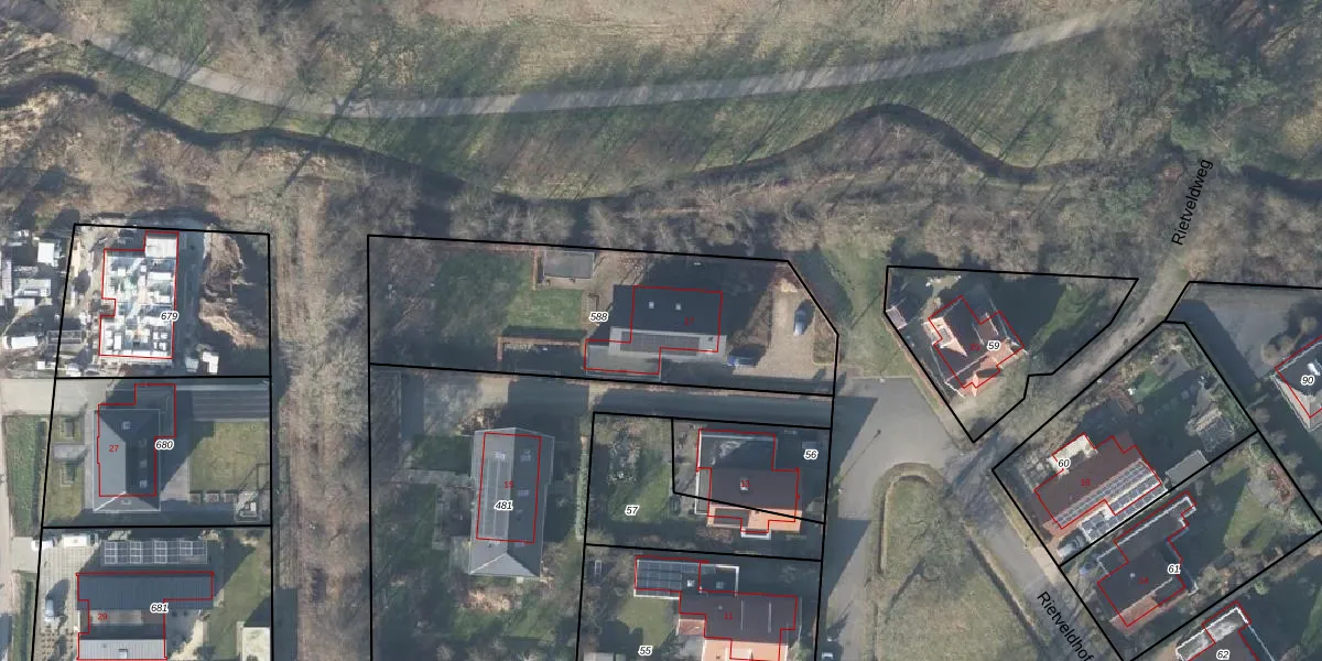 Het perceel waarop Rietveldhof 17 staat heeft een oppervlakte van 1361 m². Dit is een zeer groot perceel. De perceeloppervlakte wordt geregistreerd door het Kadaster. Gedetailleerde informatie over de maten van dit perceel kunt u vinden in het rapport Kadastrale kaart met maatvoering van Rietveldhof 17.
