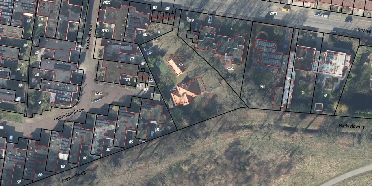 Rietveldweg 20 is gelegen op kadastraal perceel LNK00Z42. Deze kadastrale aanduiding is uniek en wordt gebruikt door het Kadaster om eigendomsrechten en andere zakelijke rechten vast te leggen. Het perceel maakt onderdeel uit van de kadastrale gemeente Lonneker.