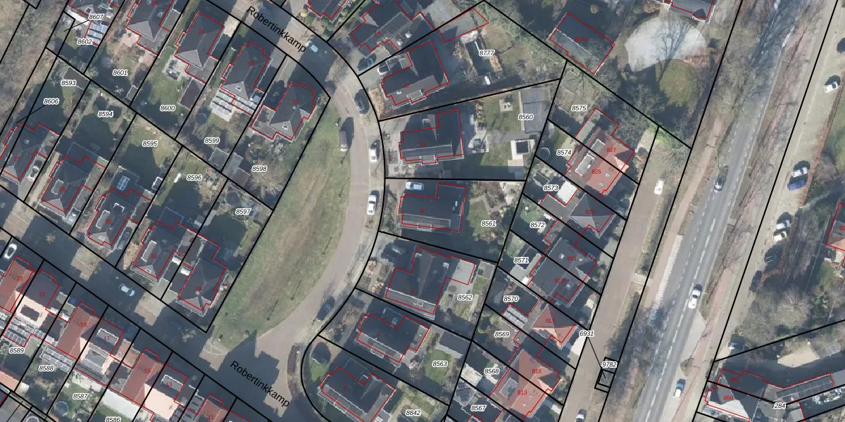 Het perceel waarop Robertinkkamp 8 staat heeft een oppervlakte van 509 m². Dit is een groot perceel. De perceeloppervlakte wordt geregistreerd door het Kadaster. Gedetailleerde informatie over de maten van dit perceel kunt u vinden in het rapport Kadastrale kaart met maatvoering van Robertinkkamp 8.