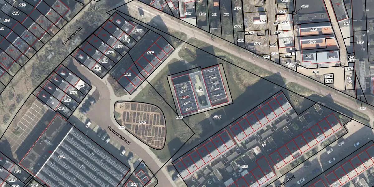 Het perceel waarop Robsonstraat 37 staat heeft een oppervlakte van 700 m². Dit is een groot perceel. De perceeloppervlakte wordt geregistreerd door het Kadaster. Gedetailleerde informatie over de maten van dit perceel kunt u vinden in het rapport Kadastrale kaart met maatvoering van Robsonstraat 37.