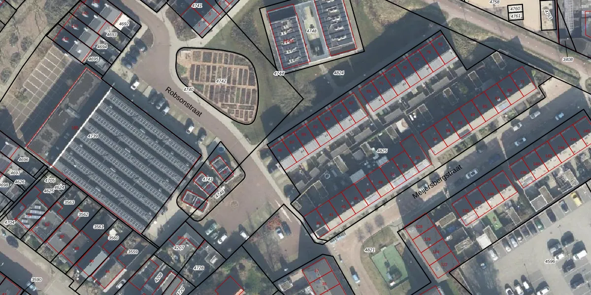 Het perceel waarop Robsonstraat 57 staat heeft een oppervlakte van 3166 m². Dit is een zeer groot perceel. De perceeloppervlakte wordt geregistreerd door het Kadaster. Gedetailleerde informatie over de maten van dit perceel kunt u vinden in het rapport Kadastrale kaart met maatvoering van Robsonstraat 57.